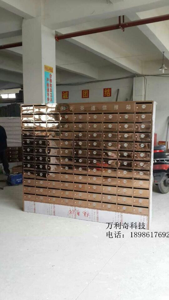 由万利奇科技制作的三和·光谷道信报箱,门板为玫瑰金不锈钢镜面板,周边板、横竖隔条为玫瑰金不锈钢镜面板。箱体不锈钢玫瑰金信报箱给人一种奢华,大气、美观的感觉。玫瑰金信报箱不锈钢玫瑰金信报箱